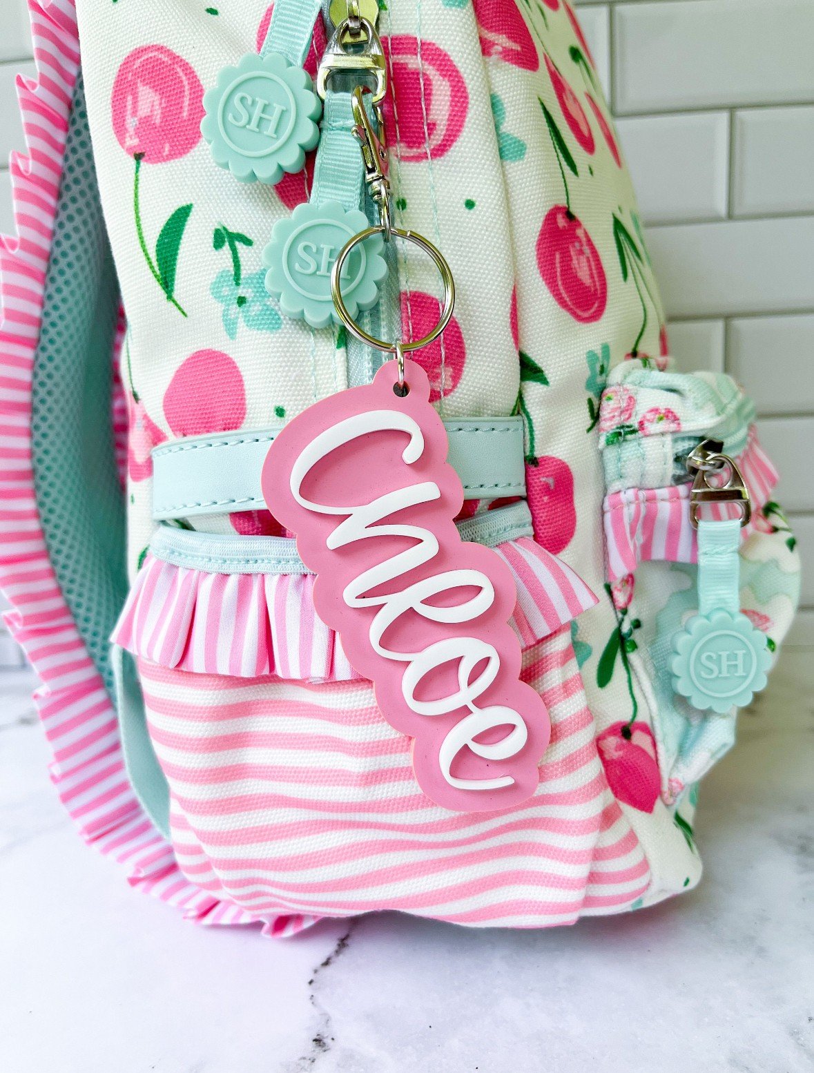 Made from 3mm thick acrylic you can customize any name, font or color! Bag tags are approximately 3-5” long depending on the length of the name and around 1.5-2” tall, larger for a backpack, diaper Bag or lunch box. For smaller keychains see our keychain selection. Each bag tag comes with a clip on key ring.